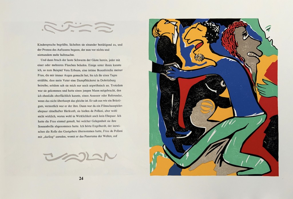 Der Text – von Harald Weller aus der Times 12 Punkt gesetzt – die Textseiten, mit Verzierungen in leichtem Grau (s. Abb.), wurden wie auch die Originalgrafiken an der Andruckpresse in meiner Werkstatt gedruckt. Gesamtauflage 40 Exemplare, wovon 38 in den Handel gelangen. Mit dreizehn Farblinolschnitten.